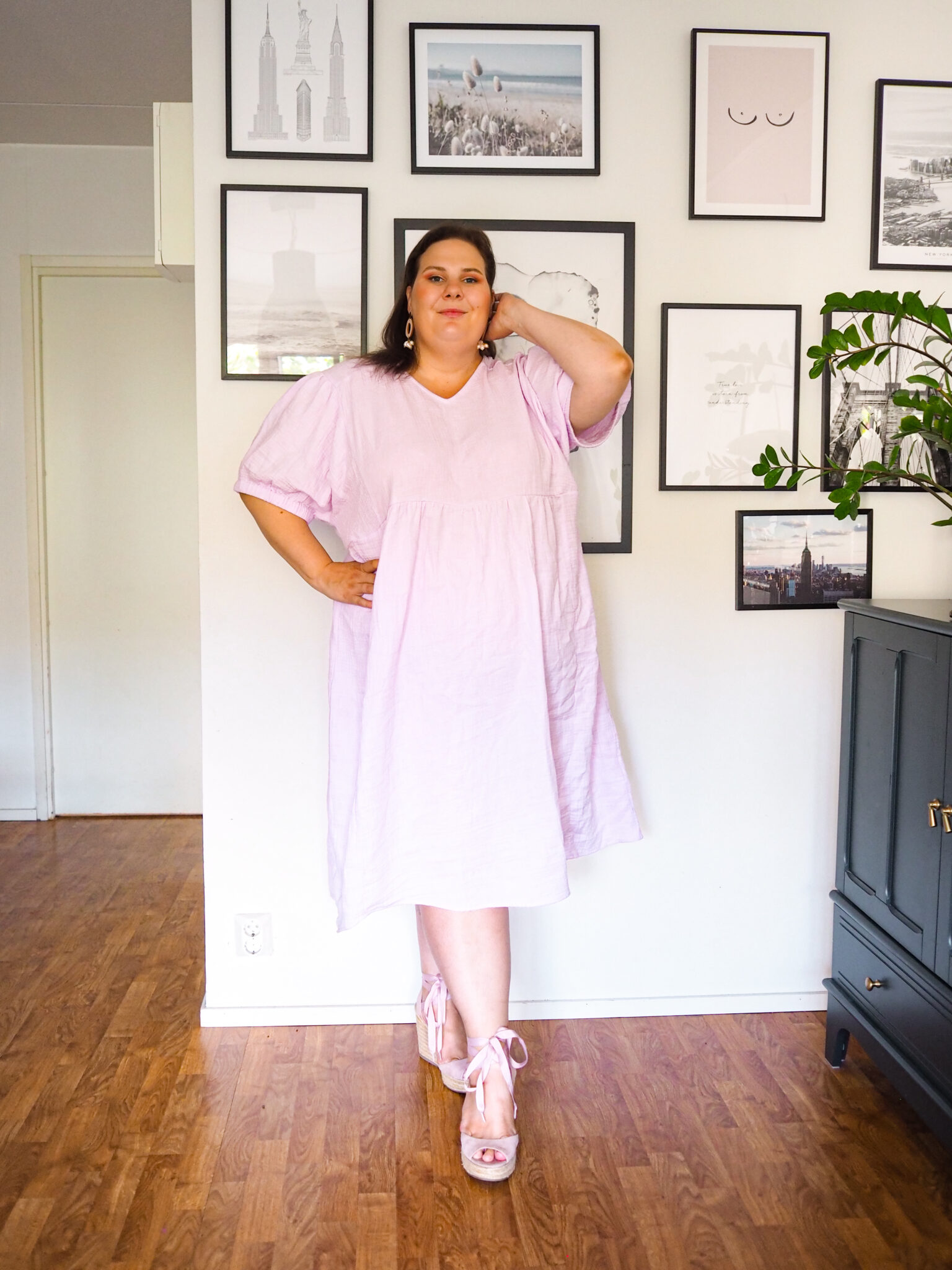 Tämä musliinimekko on ihanan kevyt ja mukava päällä. Olen rakastunut musliinikankaisiin mekkoihin. Se on päällä ihan super pehmeää. Ne ovat myös rentoja ja huolettomia, mikä sopii tähän meidän tämän hetkiseen arkeen vallan mainiosti. Parasta on, kun voi vetää vain kivan mekon päälle ja on valmis päivän menoihin. Tämän mekon vaalean lila väri on aivan ihana.