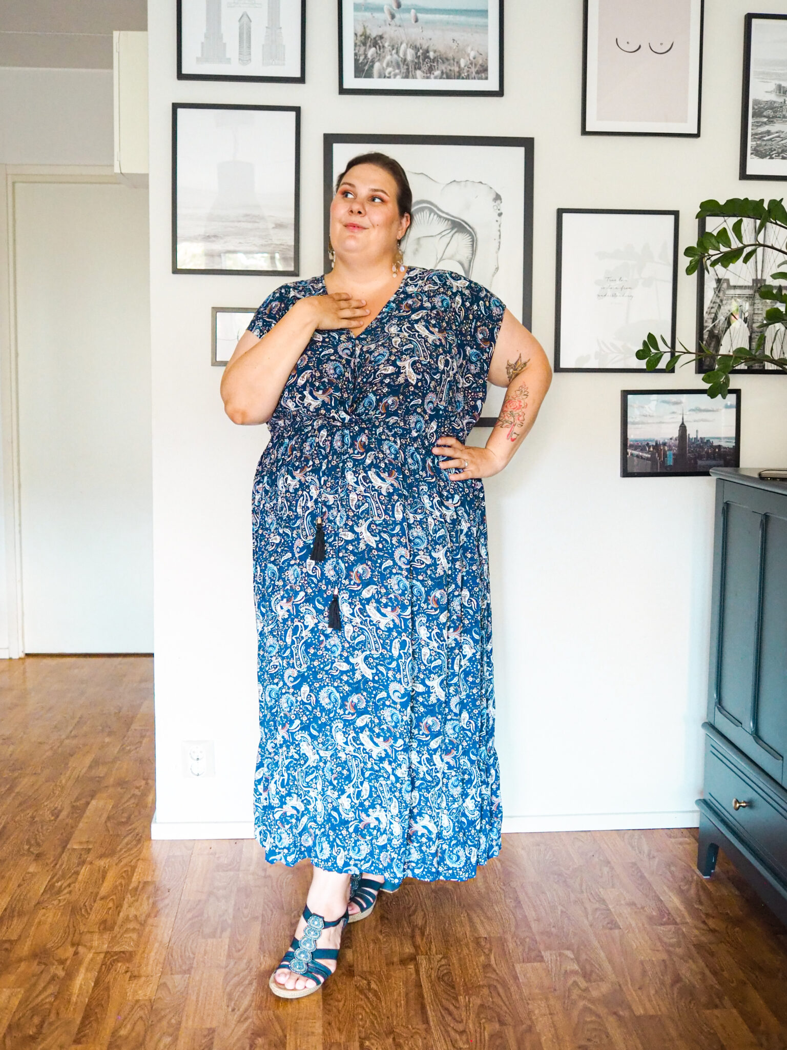 Totte sanoi tätä mekkoa fancyksi, minä sanon tätä moderniksi hippikaavuksi. Tämä mekko on aivan upea. Minulla ei ole tällä hetkellä kovin montaa näin pitkää mekkoa. Etumuksessa on nepparikiinnitys, mikä estää ei toivotut vilauttelut. Vyötärönauhan tupsut ovat ihana yksityiskohta mekossa.