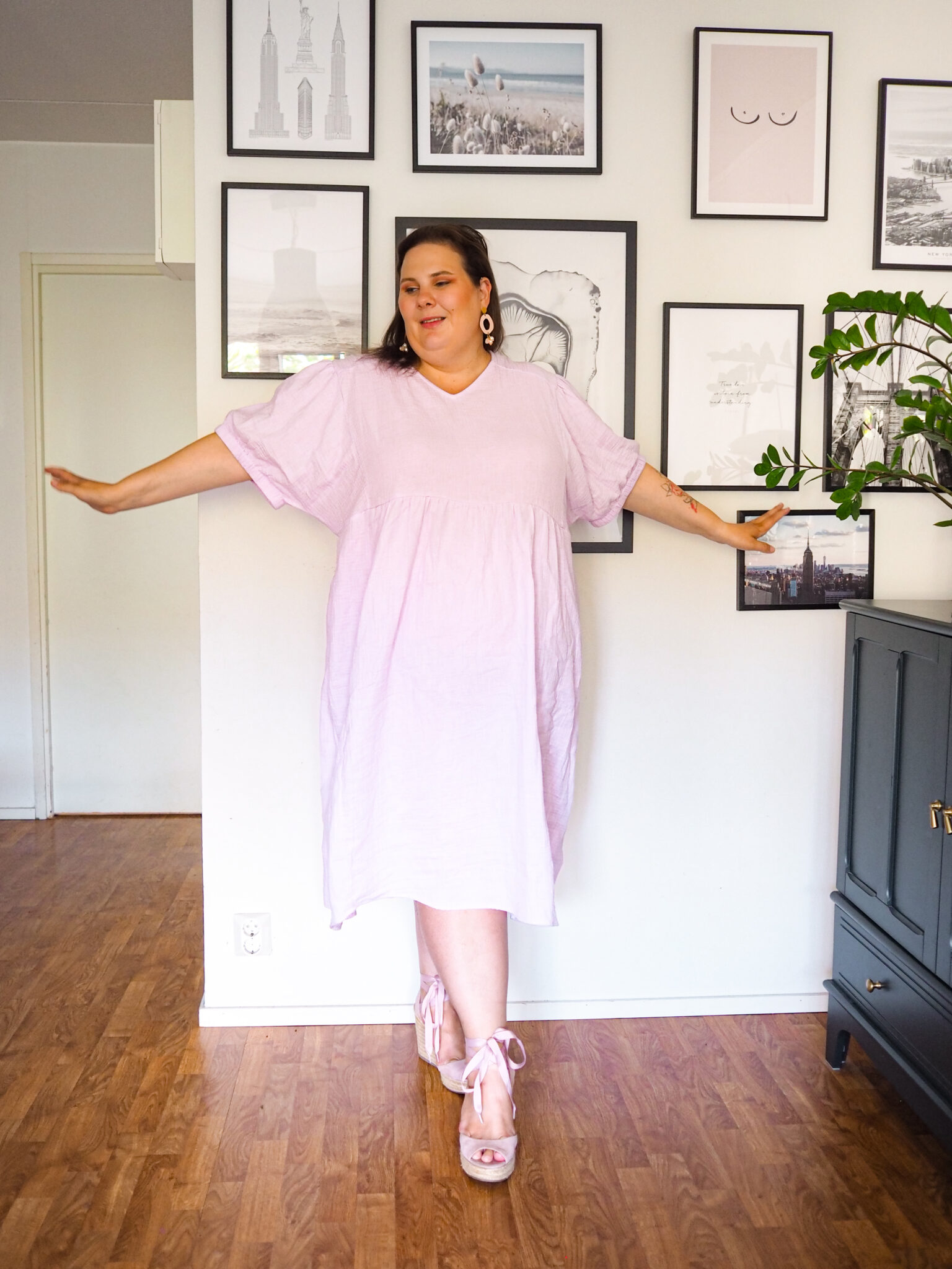 Tämä musliinimekko on ihanan kevyt ja mukava päällä. Olen rakastunut musliinikankaisiin mekkoihin. Se on päällä ihan super pehmeää. Ne ovat myös rentoja ja huolettomia, mikä sopii tähän meidän tämän hetkiseen arkeen vallan mainiosti. Parasta on, kun voi vetää vain kivan mekon päälle ja on valmis päivän menoihin. Tämän mekon vaalean lila väri on aivan ihana.