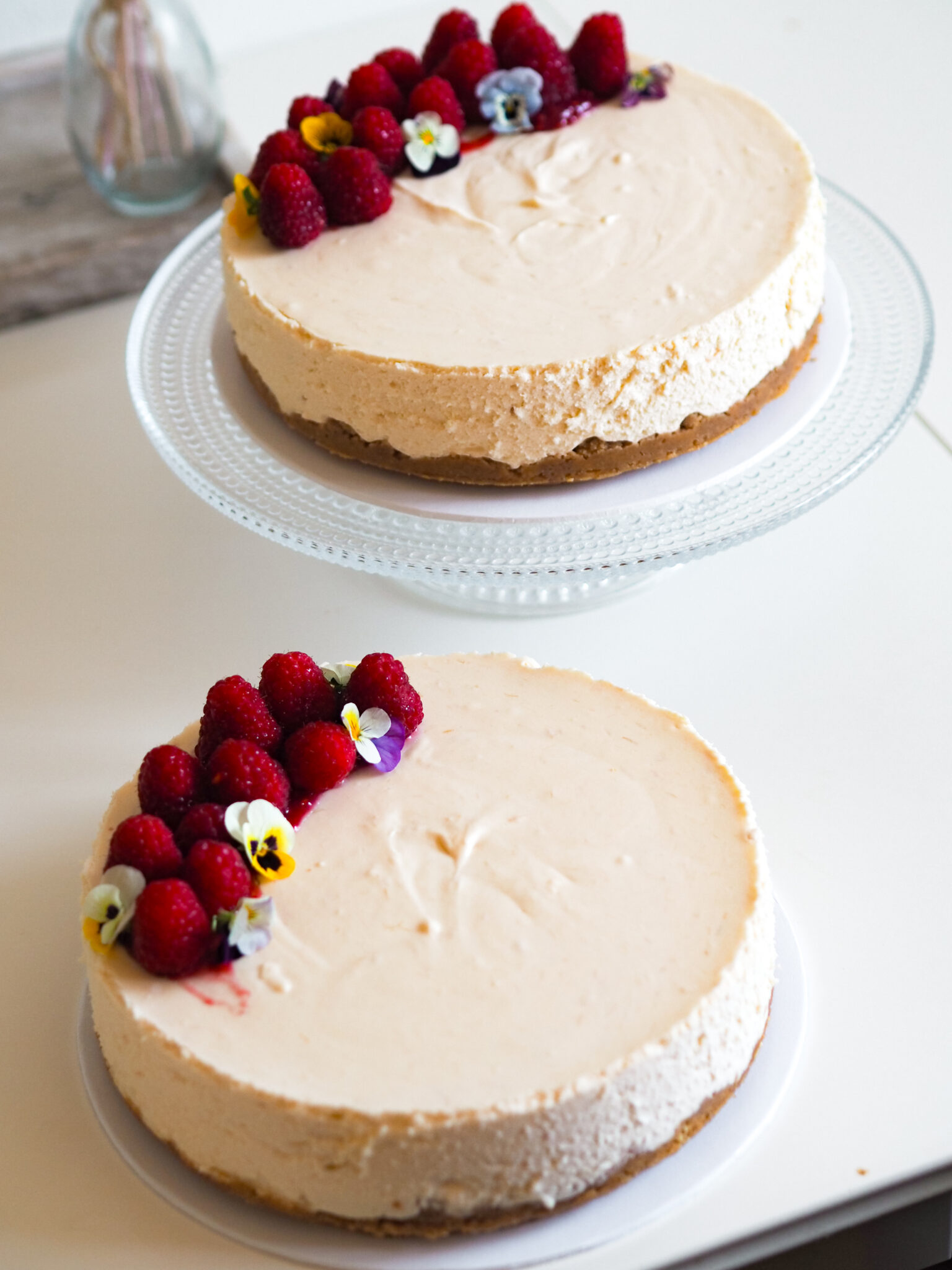 Tein kakut hyvin tarkkaan toiveiden mukaan. Maku toiveena oli raparperi-valkosuklaa ja koristeeksi toivottiin syötäviä kukkia ja marjoja. Mielstäni niistä tuli kaikessa yksinkertaisuudessaan todella kauniit. Jälkeen päin sain kiitoksia ja kehuja. Kakut olivat maistuneet ja menneet viimeistä murua myöten. Mikä on ehkä paras palaute, mitä voin saada.