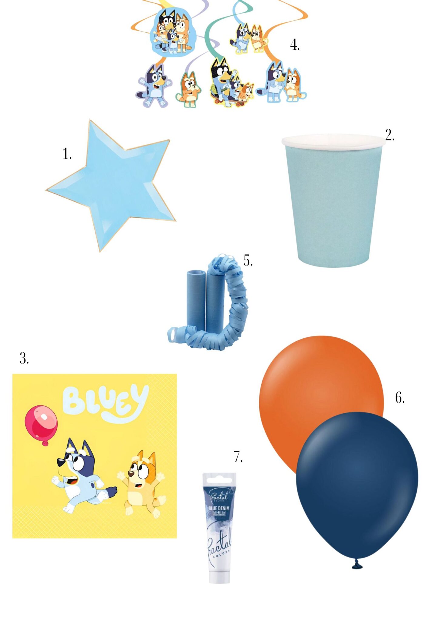 Vaikka juhlat olivat Bluey -teemaiset, en halunnut ostaa pelkästään printtituotteita. Servetit ja roikkuvat koristeet korostivat teemaa riittävästi. Toki meidän kakku teki sen myös. Muuten päädyttiin simppeleihin, sinisiin tuotteisiin mukeissa, lautasissa ja serpentiinissä. Tämä yhdistelmä toimi super hyvin ja miellytti silmää. Ilmapalloiksi valittiin Blueyn ja Bingon väreissä vaalean ja tummansinistä, sekä vaalean ja tummemman oranssia.