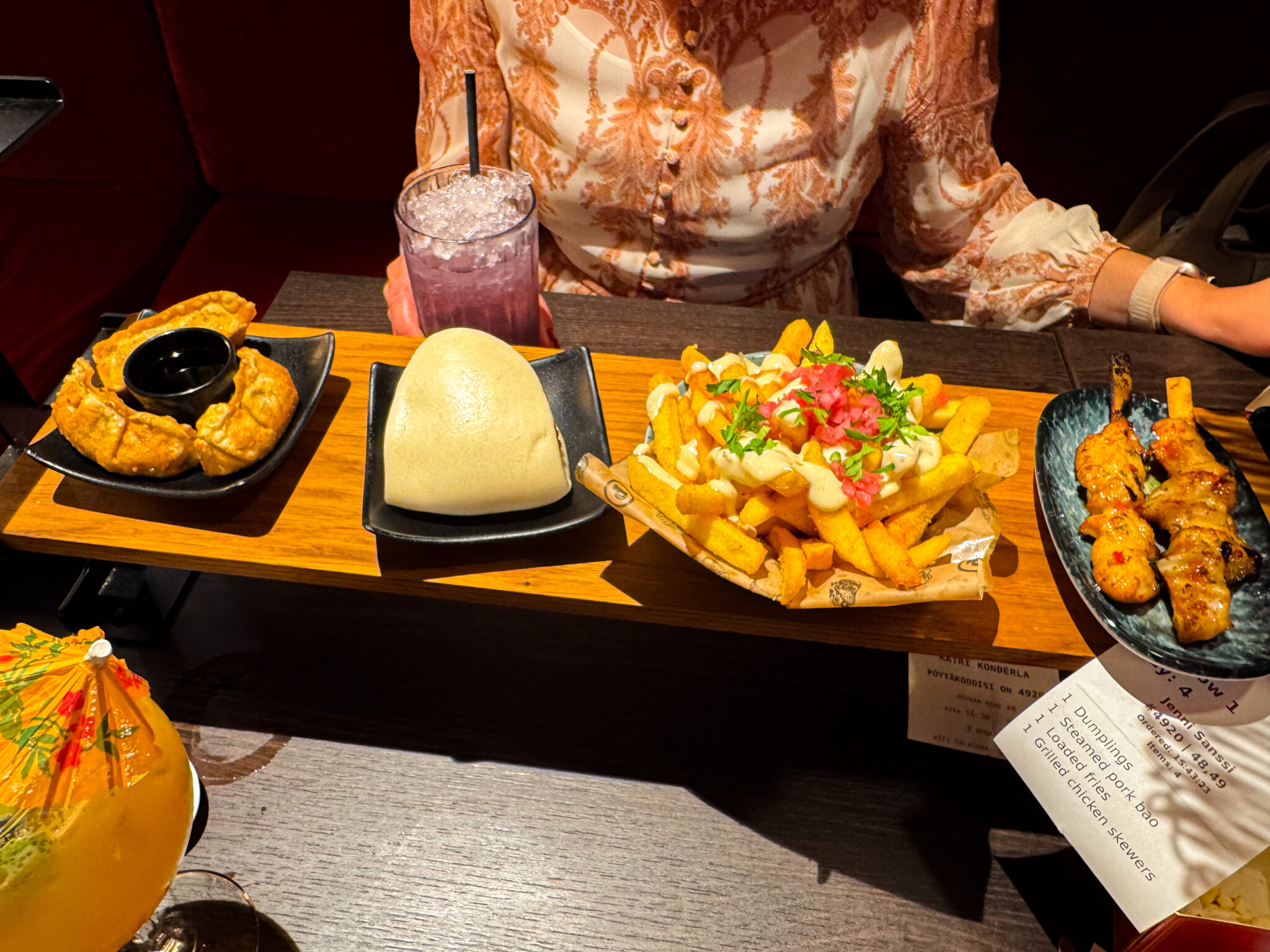 Loaded fries oli yksi suosikeistani. Täydelliset ranskalaiset. Tämä annos kannattaa kuitenkin melkein ottaa jaettavaksi. Dumblingssit ja kanavartaat olivat myös todella hyviä. Bao bun ei ollut ihan omaan makuuni, vaikka ei siinäkään mitään vikaa ollut. Listalta löytyi myös isoäidin lihapullat.