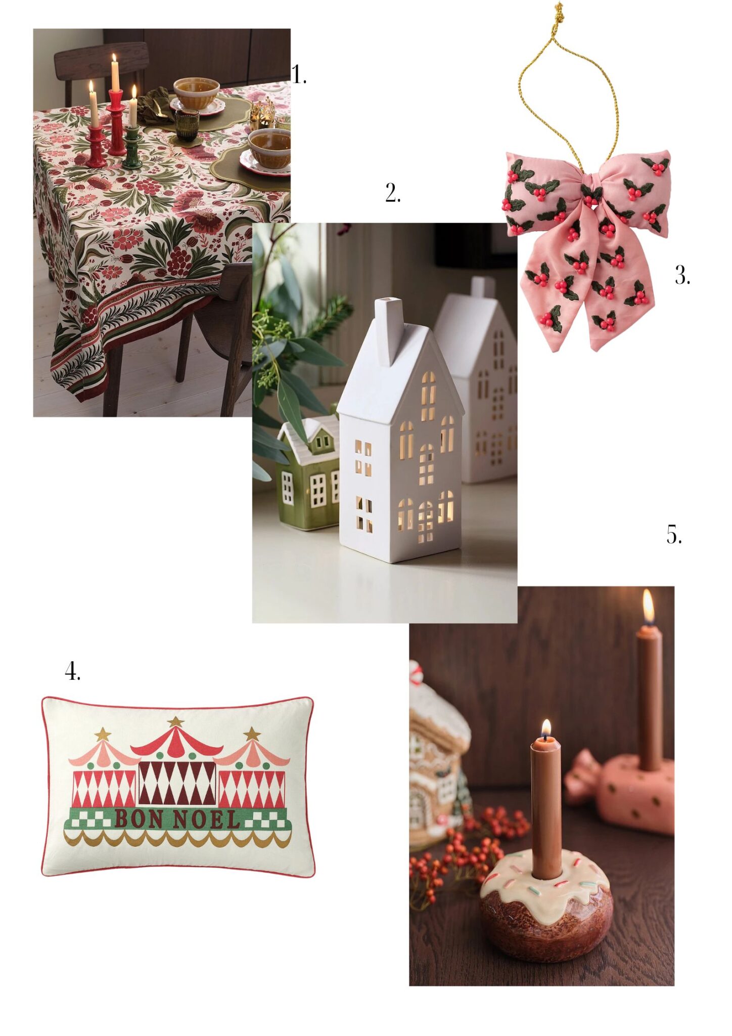 1. Täydellinen joulupöytäliina (mainoslinkki*) 2. Ihana kynttilätalo (mainoslinkki*) 3. Ehkä söpöin joulukoriste (mainoslinkki*) 4. Ihana tyyny (mainoslinkki*) 5. Kynttilänjalka (mainoslinkki*)