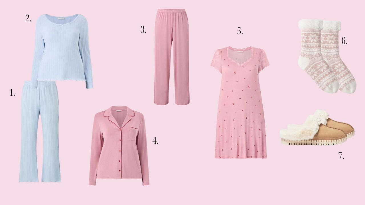 1. Pyjamahousut (mainoslinkki*) 2. Pyjamapaita (mainoslinkki*) 3. Pyjamahousut (mainoslinkki*) 4. Pyjamapaita (mainoslinkki*) 5. Yöpaita (mainoslinkki*) 6. Pörrösukat (mainoslinkki*) 7. Tohvelit (mainoslinkki*)