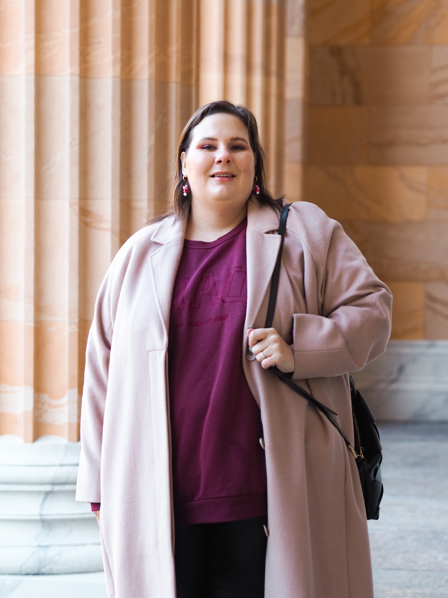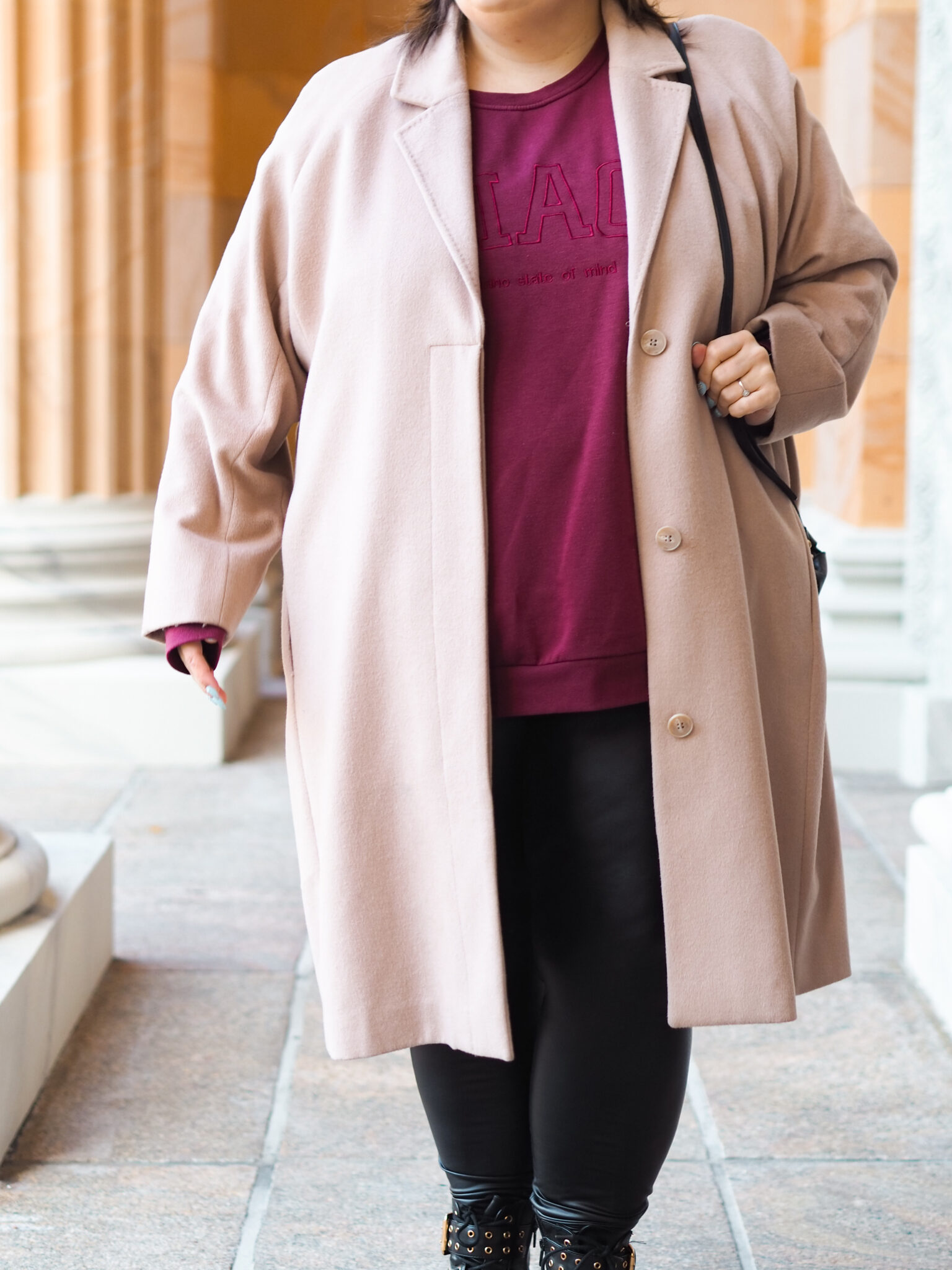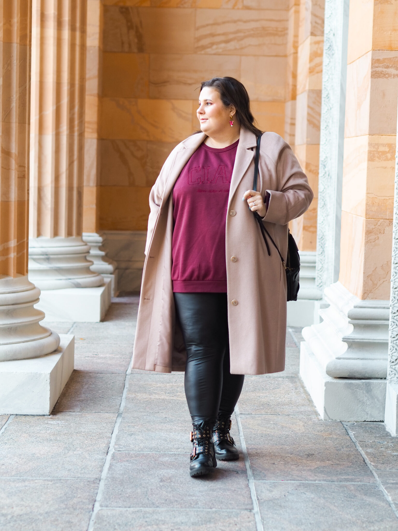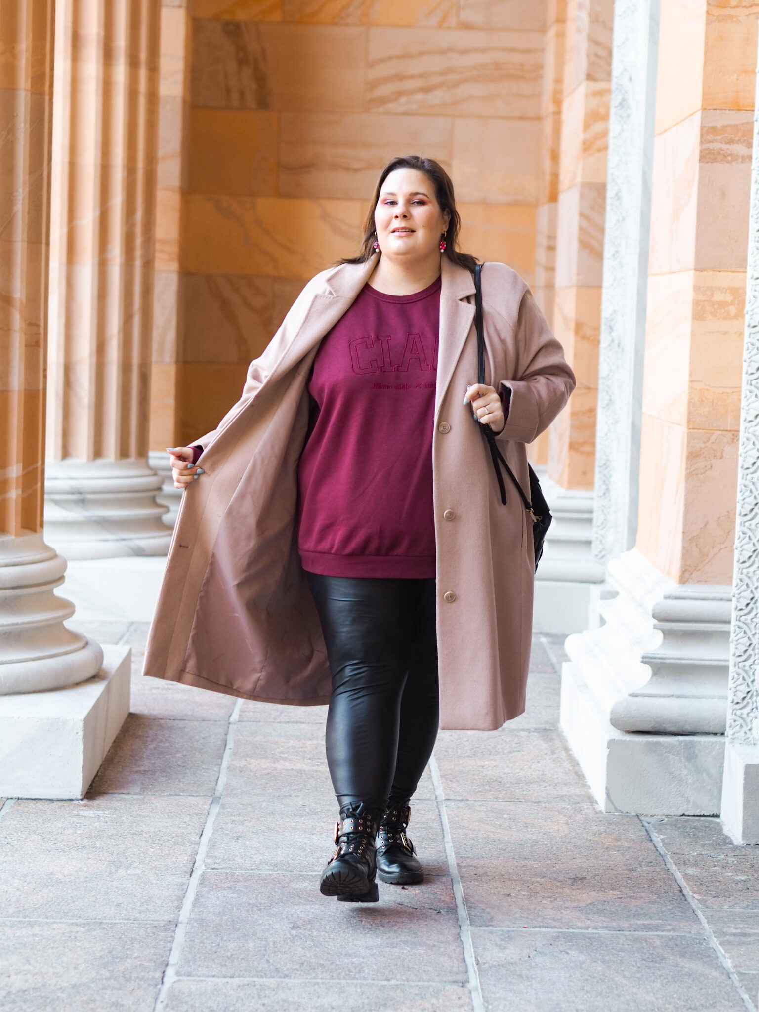 Tykkään muutenkin todella paljon tästä yhdistelmästä, tosi rento college-pusero, siisti ja pitkä takki ja sitten rouheutta keinonahkalegginsseillä, sekä maihareilla. Nämä kaikki sopii niin hyvin yhteen, että ei ole tosikaan. 🤩