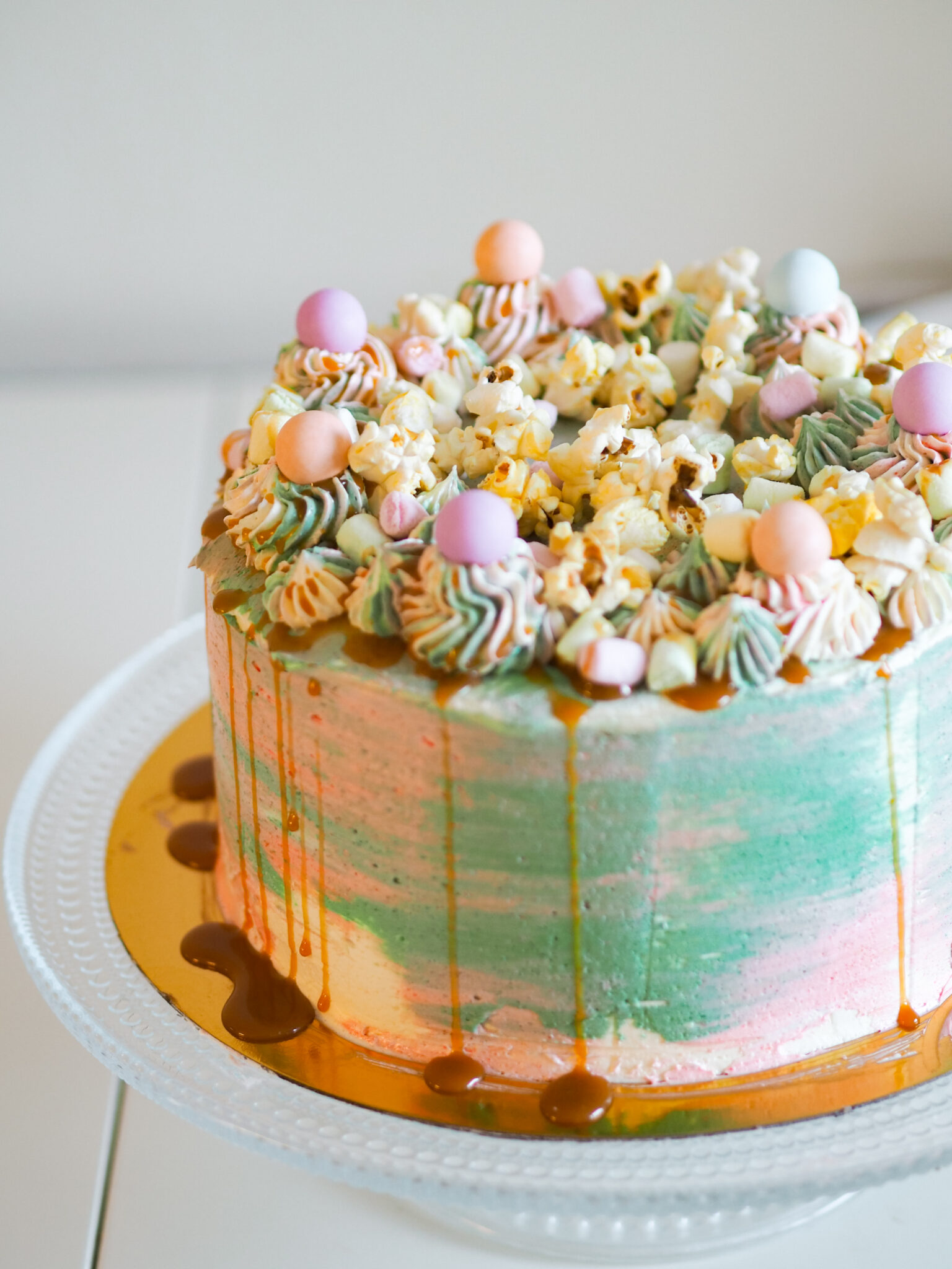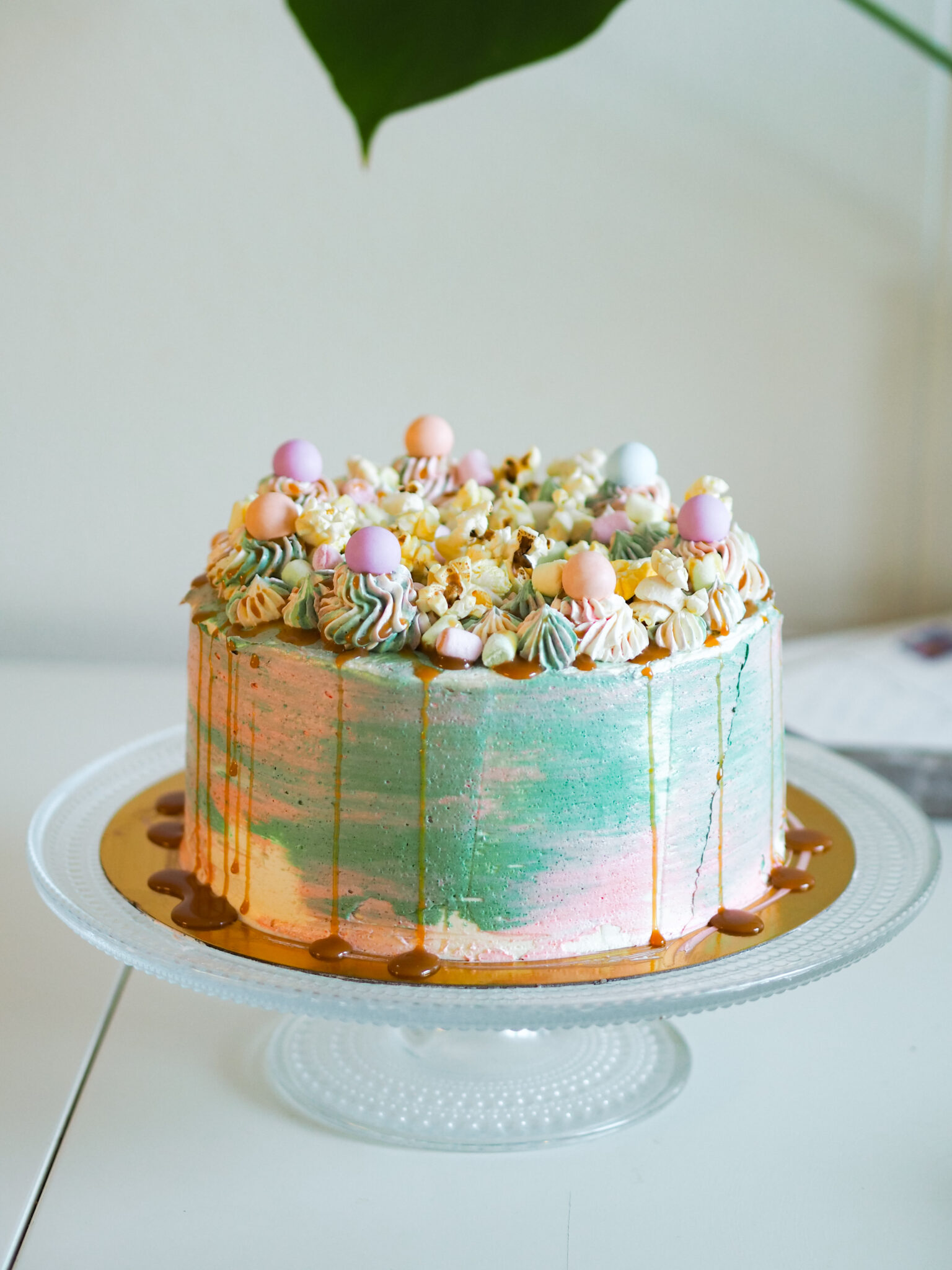 Kiitos! 🤩 Käytännössä tein kakkuun valkoisella kreemillä murukerroksen, käytin jääkaapissa jotta kreemi jähmettyy. Sitten oikeastaan vaan lätkin pintaan kahta eri värikästä kreemiä ja tasoitin lastalla.