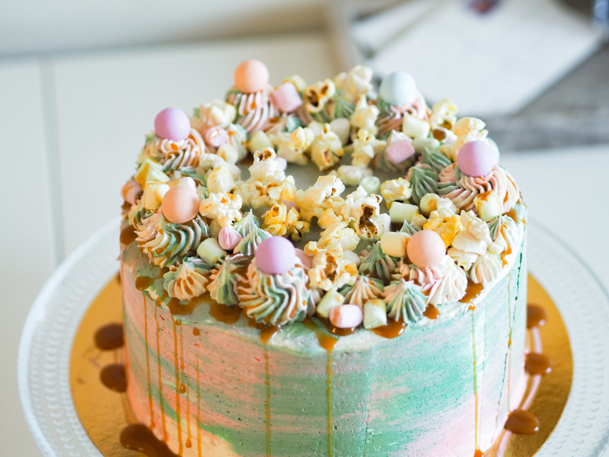 Sukulaissynttäreille leivoin suklaakakkupohjan (tällä ohjeella), jonka täytin paahdetulla vaahtokarkkitäytteellä ja kuorrutin marenkikreemillä (ohje täällä). Koristelussa käytin myös popkornia, vaahtokarkkeja, suklaakuulia ja kinuskikastiketta. Päivänsankarit totesivat, että tämä on ehdottomasti paras kakku jonka olen koskaan tehnyt.