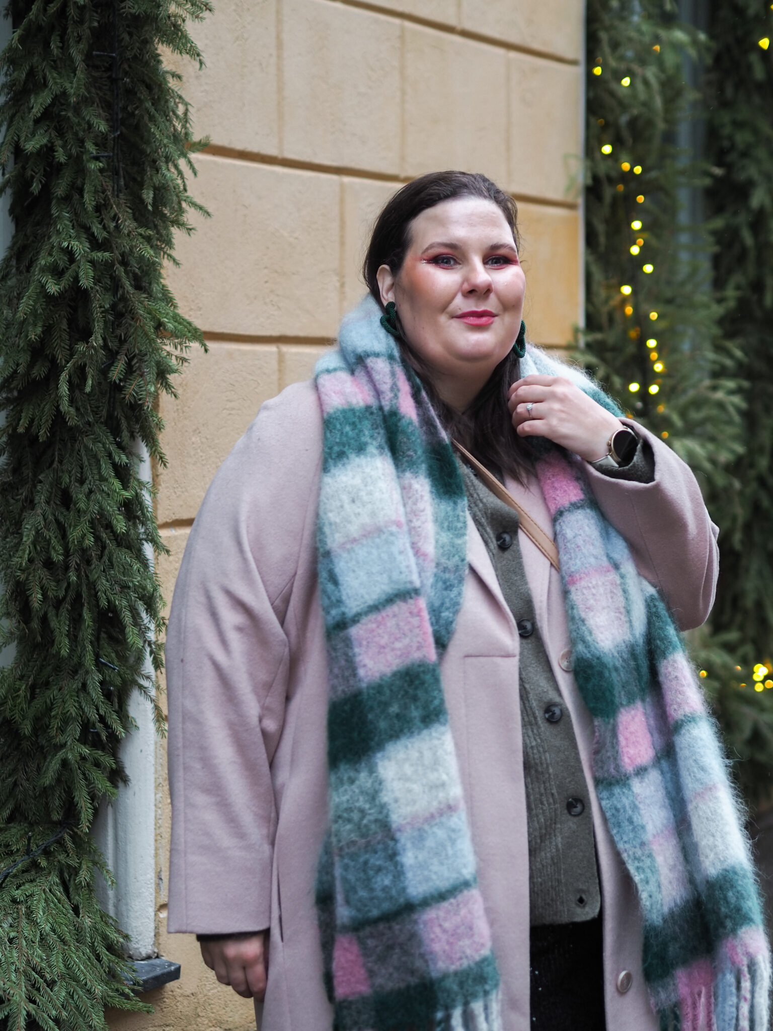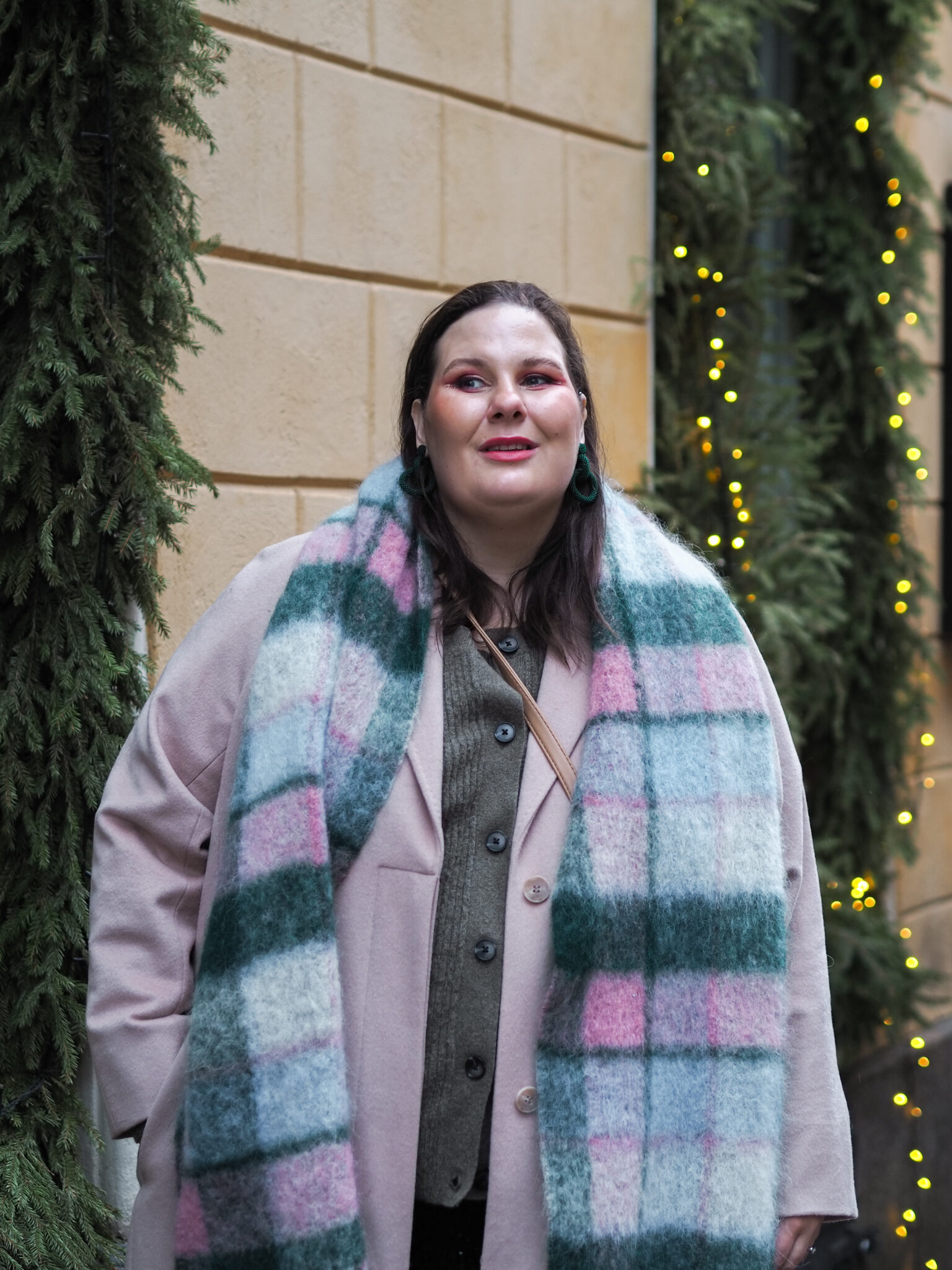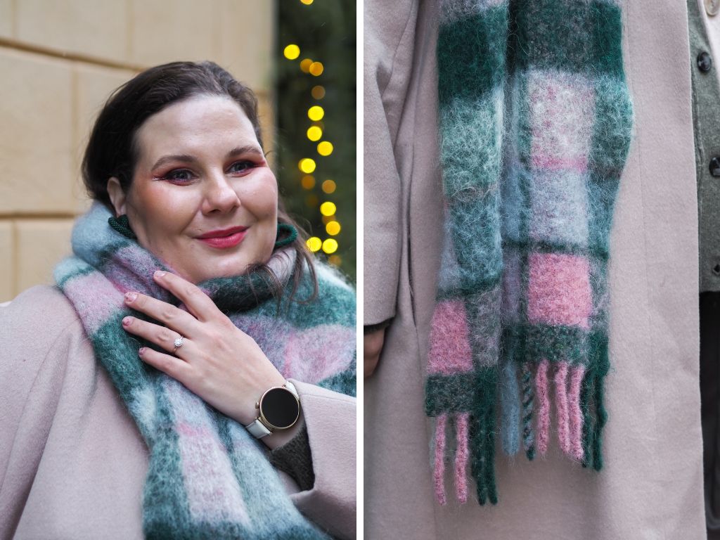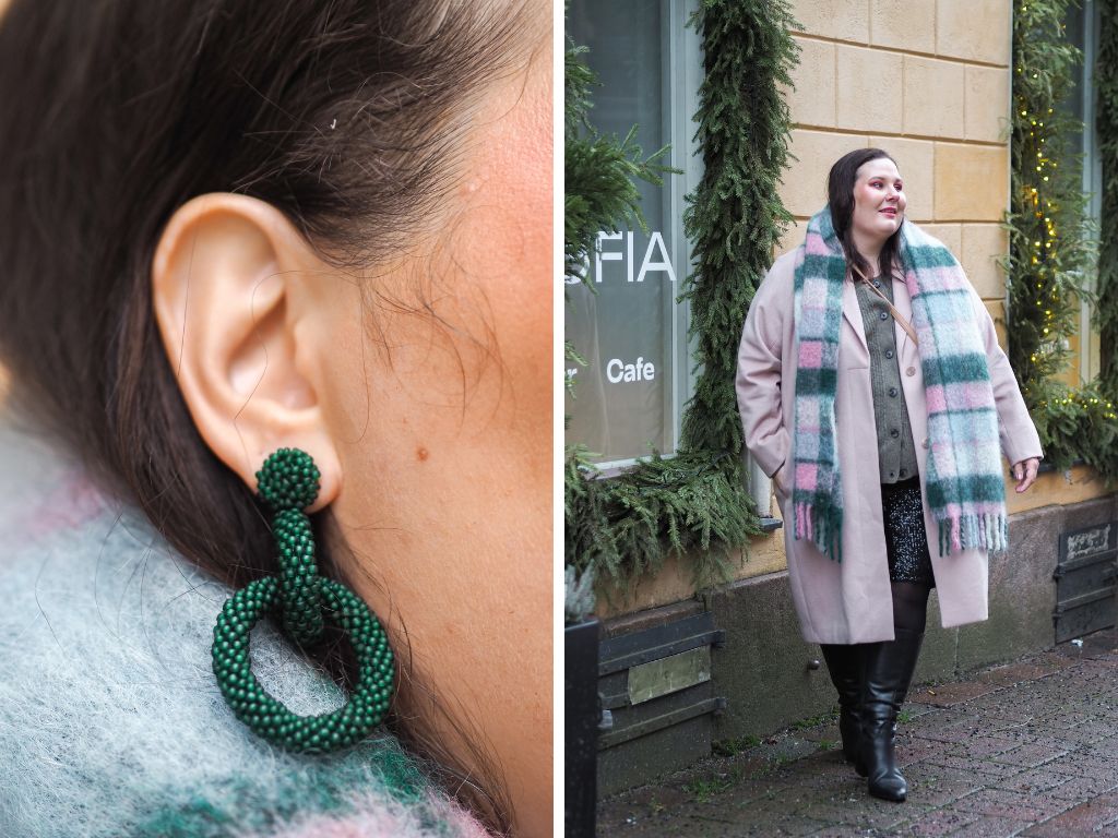 Rakastan sitä, miten tuo Noshilta viime vuonna saamani huivi ja Kaikon vihreät korvakorut sopivat yhteen. Värit ovat ihan täydellinen pari. Huivi on super lämmin ja muhkea. Siitä saa helposti kiedottua pään ympärille lämpöisen hupun halutessaan. Olen tosin käyttänyt nyt talvella todella paljon ostamaani balaclavaa, joka on ollut ihan lyömätön asuste talvella. Se suojaa samaan aikaan kaulaa, korvia ja päätä. Kovimmilla pakkasilla olen laittanut vielä pipon alle, jolloin yhdistelmä on ollut ekstra lämmin. Suosittelen kokeilemaan.