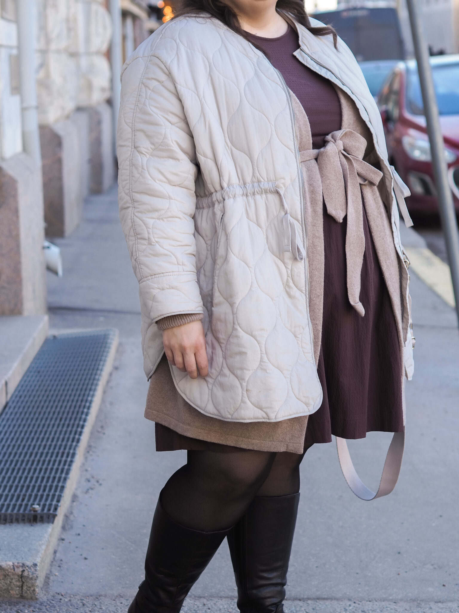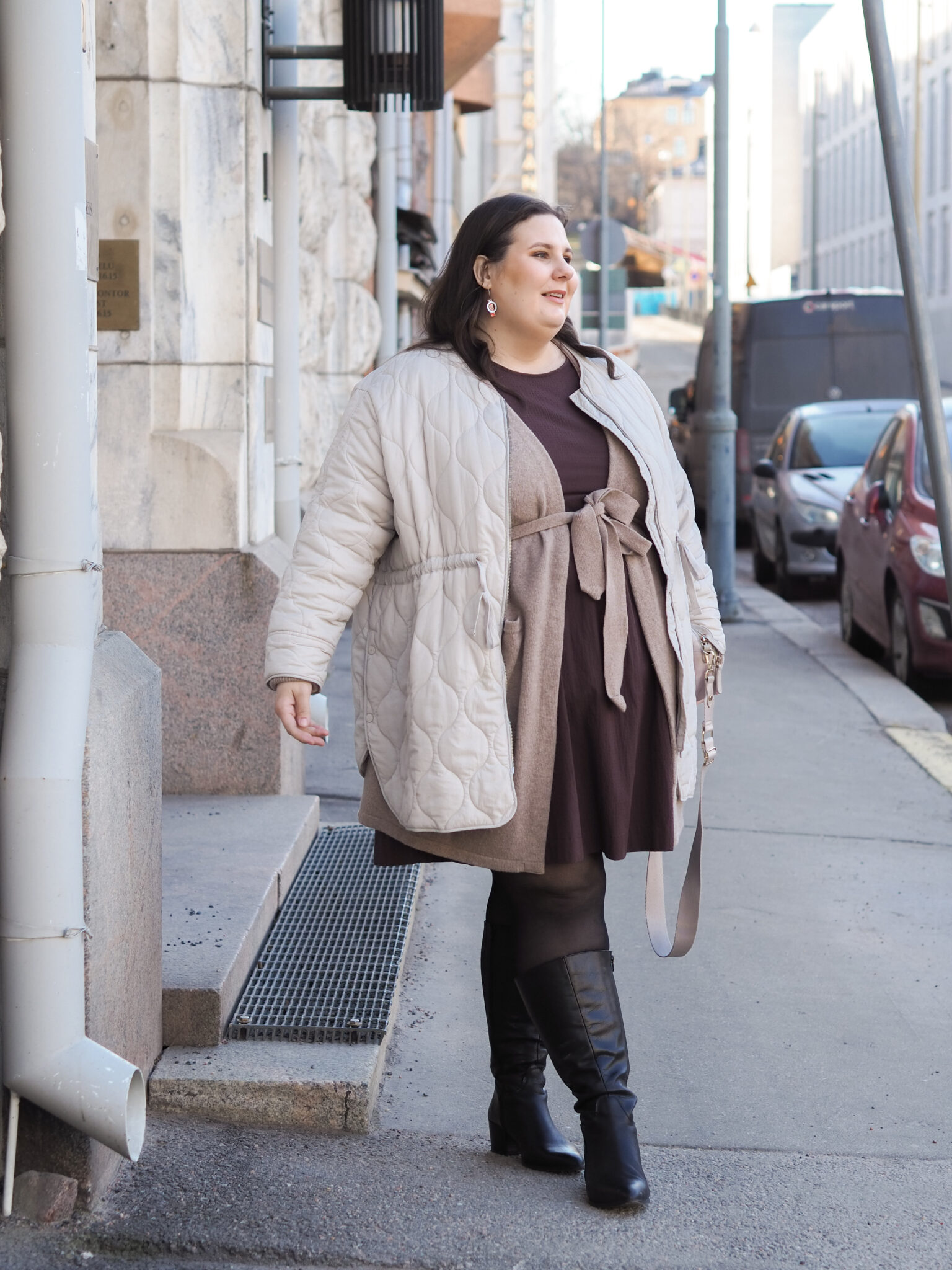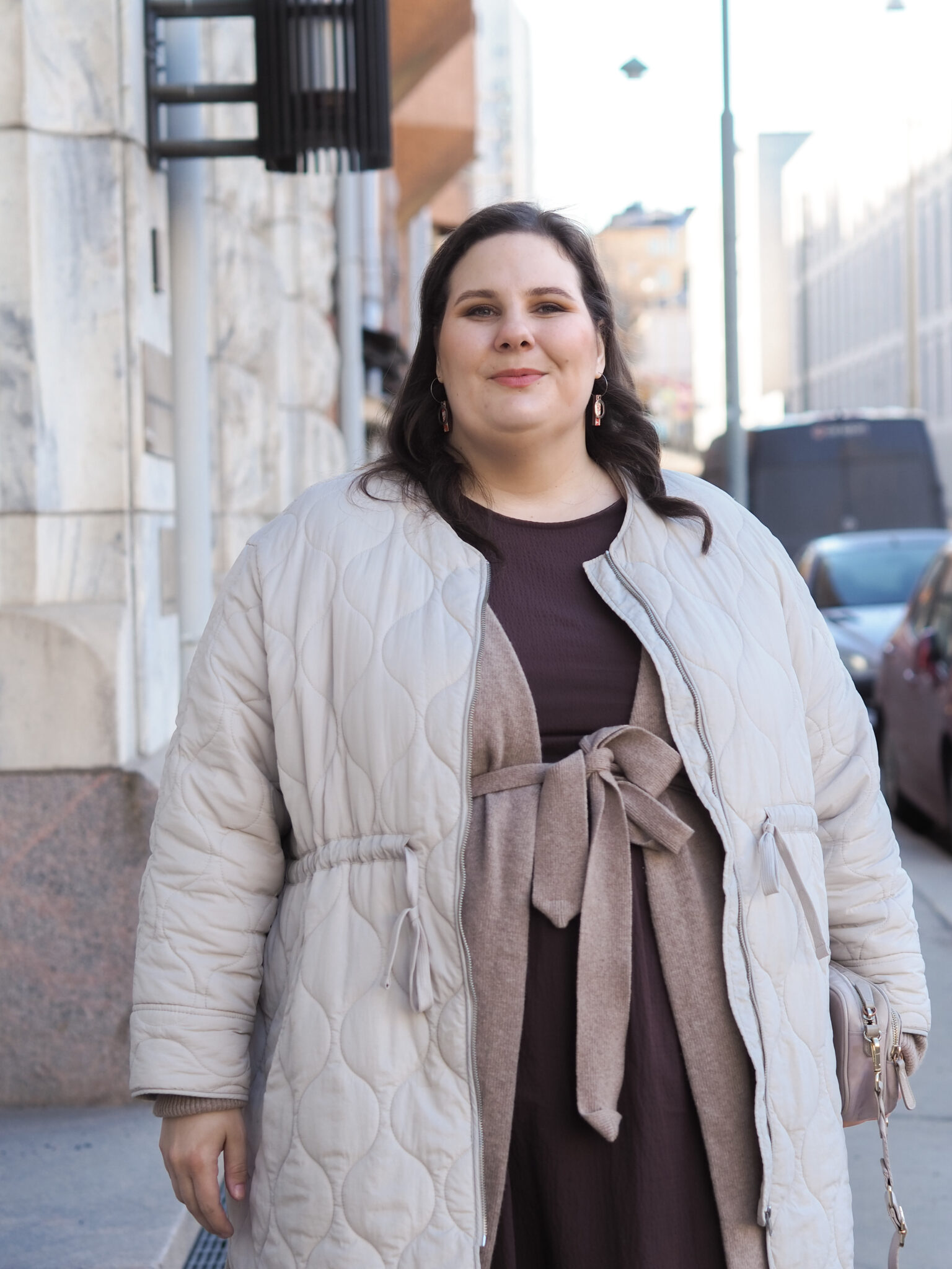 Esittelin kuvissa näkyvän ruskean mekon teille ensimmäistä kertaa syksyllä. (Linkki blogipostaukseen.) Tämä on edelleen aivan ihana mekko ja sopii lämpimän syksyn lisäksi myös tähän viileään kevääseen. Toki näissä säissä kuvissa näkyvä neuletakki tulee kyllä tarpeeseen.