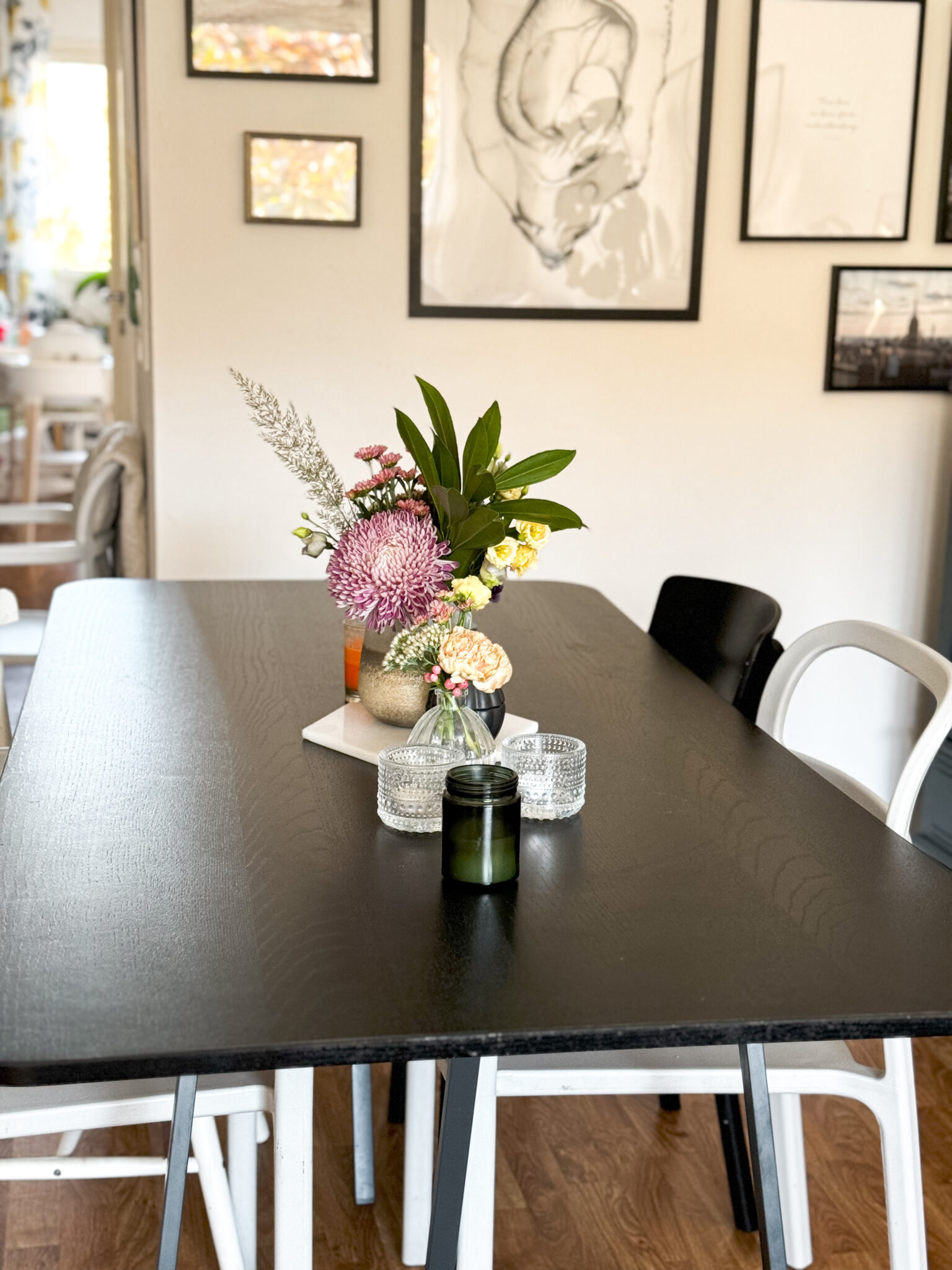 Kukat ehtivät varautumisesta huolimatta hieman nuutua matkalla, mutta ne virkosivat, kun sain ne aseteltua kotona maljakoihin. Nyt ne tuovat minulle taas aivan suunnatonta iloa. Vitsailtiin Toten kanssa siitä, että olen periaatteessa suht helppo nainen. Tulen onnelliseksi ihan vain kukista. En tarvitse merkkilaukkuja ja timantteja, vaan kukkakimppu riittää.