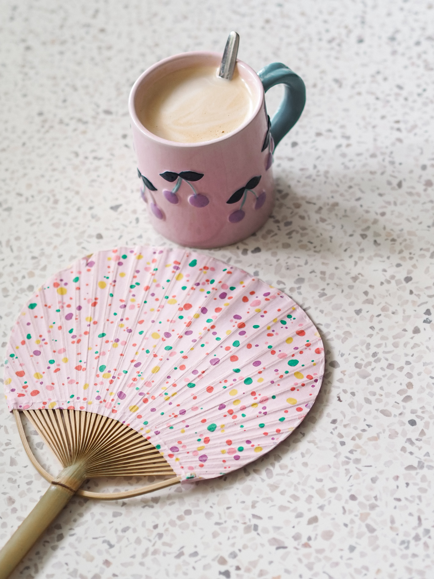 Viime aikoijen kuuman kosteat päivät saivat minut hankkimaan viuhkan. Olen siis haaveillut sellaisesta jo viime kesänä, kun raskaana ollessa kuumuus otti todella voimille. Tänä kesänä toteutin tämän kahden euron haaveen. Löysin oman viukani Tigerista. Samalla bongasin sieltä kaksi älyttömän söpöä mukia. Toisessa oli kirsikoita ja toinen oli tissi-muki. Kävin ostamassa nämä seuraavana päivänä.