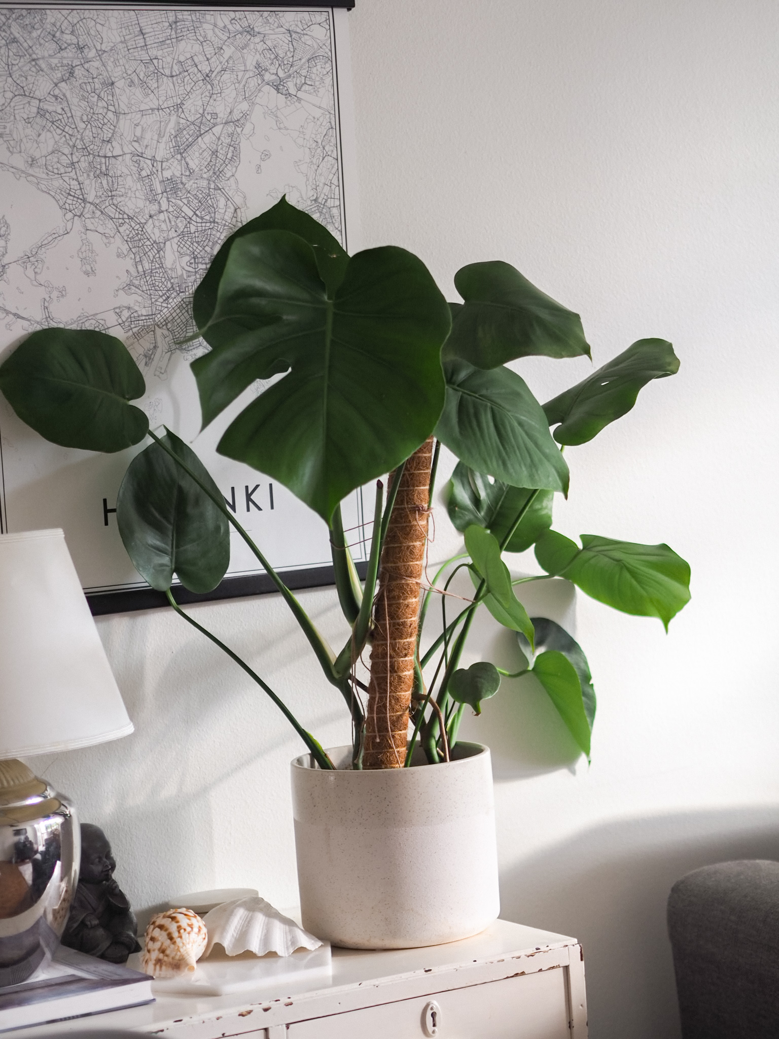 Meidän koti on aavistuksen ahnkala valon kannalta. Se on siis melko pimeä. Valo ei riitä kaikilla kasveille niin kuin pitäisi. Paras olisi, jos kasveja kantaisi huoneesta toiseen vuorokauden ajan mukaan. Nyt siirsin tuon ison peikonlehden olohuoneeseen mamman perintölipaston päälle. Toivon, että se saa siinä riittävästi valoa. Se nimittäin teki nyt ensimmäisen kunnolla halkioisen lehtensä. Minulle kerrottiin, että se tarvitsee valoa näihin halkiolehtiin. Joten toivotaan, että se riittää.